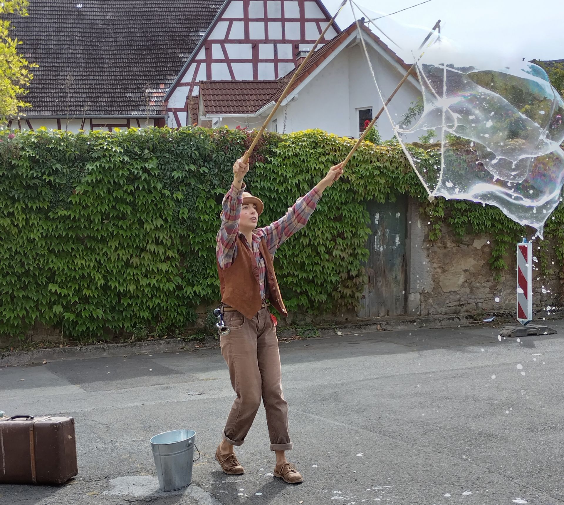 Danach kam uns schon die Performance-Künstlerin Kasia Balou entgegen und unterhielt uns auf lustige Weise mit ihren Riesen-Seifenblasen, die sich als richtige Kunstwerke erwiesen. Es gab viel Applaus für sie.